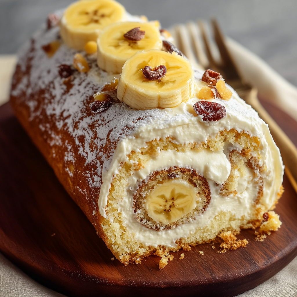 A delightful Banana Cake Cream Cheese Roll filled with a creamy cheese mixture and rolled with a banana-flavored cake, topped with a sweet glaze and pecans.